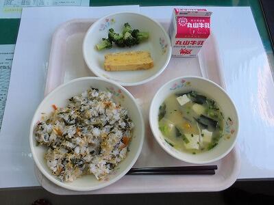 菜めし・卵焼き・ブロッコリー・みそ汁・牛乳