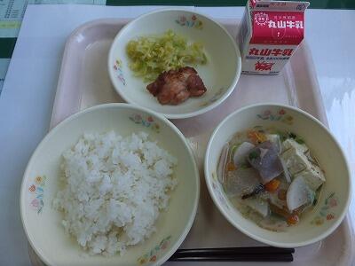 麦ごはん・七味焼き・ボイルキャベツ・根菜ごま汁・牛乳