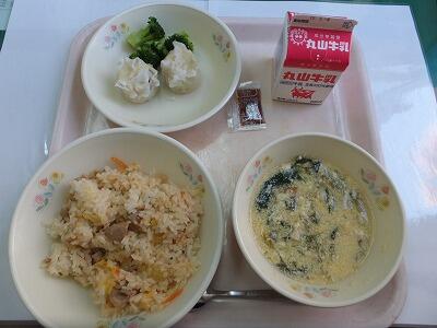 キムチチャーハン・豆腐シューマイ・ブロッコリー・チンゲンサイのかき玉汁・牛乳