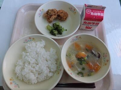 麦ごはん・唐揚げ・ブロッコリー・根菜ごま汁・牛乳