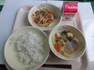 芋は昔から人間が食べてきた食品です。芋にはじゃが芋・さつま芋・山芋・里芋等があり、中でも里芋は縄文時代から日本で食べられてきました。里芋は子芋がたくさんとれるため子孫繁栄の縁起物としておせち料理に使われます。芋はエネルギーのもとになる炭水化物を含み、収穫量も多いため、主食代わりとして食べられてきました。里芋のぬるぬるが嫌いという人がいるので、今日の給食では、里芋に片栗粉を付け、一度揚げてから煮込んでいます。ひと手間かけて食べやすくしてあるので、まずは食べてみてください。