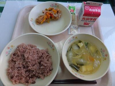 麦ごはん・いわし梅煮・菜の花のからし和え・豆豚汁・牛乳