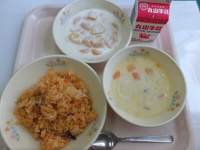 ジャンバラヤ・みそ入りスープ・フルーツヨーグルト・牛乳