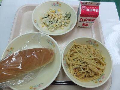 マヨネーズパン・牛肉とマカロニのトマト煮・ひじきのサラダ・牛乳