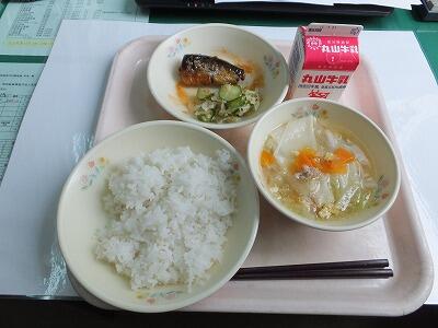 麦ご飯・鰯トマト煮・三色和え・和風ワンタン・牛乳