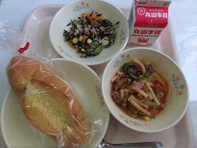 調理実習で卵やほうれん草をゆでるだけでも日頃手伝いをしているかどうかが分かります。日頃手伝いをしている人は、切り方も上手で、いらなくなった道具を洗ったり、食べる準備をしたりと、先を見越した作業ができます。いつまでもお家の人が皆さんの食事を準備することはできません。夏休みがもうすぐ来ます。お家の人に教えてもらってカレーくらいは作れるようになるといいですね。今日の夏野菜のカレーには、かぼちゃ、なす、トマトなどが入っています。嫌いな野菜でもカレー味にすると食べやすくなるので、色々な野菜を入れてみましょう。今日で1学期の給食は終わりです。夏休みになると牛乳を飲まなくなる人がいますが、牛乳には成長期に欠かせないカルシウムの他に、ビタミンB2も多く含んでいます。ビタミンB2は、皮膚や粘膜の健康に関わるビタミンで、口内炎の予防にも役立ちます。この他のビタミンも健康を維持するのに大切です。食欲がないから言って、ソーメンばかり食べていては、ビタミンが不足し夏バテということになってしまいます。夏休みもビタミンを多く含む、牛乳、卵、海藻、野菜、豆などを意識してとるようにしましょう。