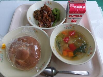 米粉パン・たこ焼き風味揚げ・枝豆・野菜のカラフルスープ・牛乳