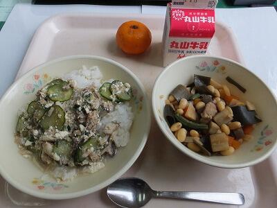 給食には豆料理がよく登場します。安い給食費で、栄養バランスの良い食事を作るのに、大豆は欠かせません。大豆は良質のたんぱく質を含み、「体をつくる」はたらきがあることから畑の肉といわれています。ビタミンB1、カルシウム、鉄も多く栄養価の高い食品です。今日は、他の豆類と一緒に豆まめサラダにしてみました。