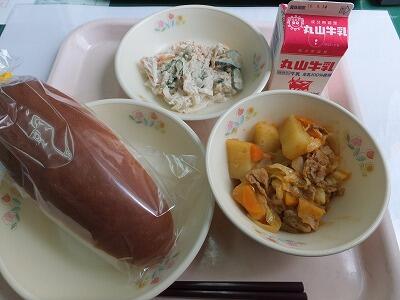 ミルクパン・肉と野菜のカレー煮込み・大根サラダ・牛乳