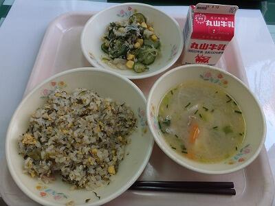 1年生の国語の教科書に「サラダでげんき」というお話があります。その中に出てくる女の子「りっちゃん」はお母さんの病気を治そうとサラダを作ることを思いつきます。たくさんの動物がアドバイス、ねこはかつおぶしを、犬はハムを、すずめはとうもろこしを、ありは砂糖を、馬はにんじんを、白くまは昆布をアフリカ象は油と塩をかけて力強くかき混ぜます。今日の給食は、このお話に出てくる材料を全部入れて「りっちゃんさらだ」という名前にしました。これを食べた皆さんもきっと元気になることでしょう。減らしたり残したりせずしっかり食べましょう。