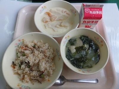 菜飯・道産子汁・もやしのごま醤油・牛乳