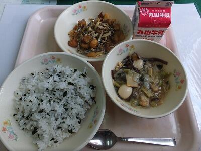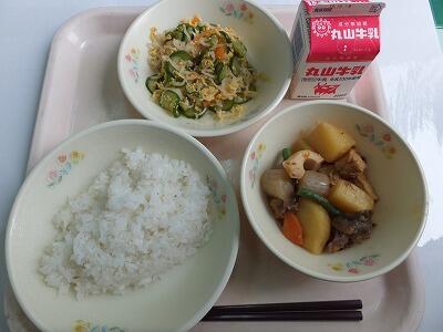 今日の給食は和食です。和食は、脂肪分が少なく健康に良い食品がたくさん使われています。今日の給食は、ご飯、煮物、和え物、汁物という組み合わせで、使われている材料は野菜がたっぷりです。野菜には、体の中にたまった老廃物を体の外に出しお腹の掃除をしてくれる食物繊維がたくさん含まれています。