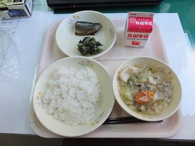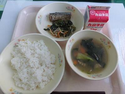 麦ご飯・秋刀魚の甘露煮・ほうれん草と沢庵のごま和え・せんべい汁・牛乳
