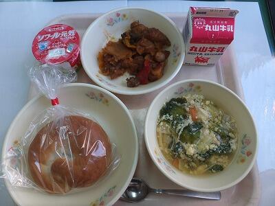 米粉パン・ポテトのマリアナソース・チンゲン菜のかき玉汁・ヨーグルト・牛乳