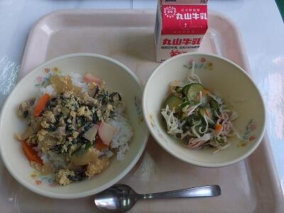 今日の給食「土佐酢和え」の「土佐」は、高知県のことです。土佐は、鰹の一本釣りで有名です。土佐酢和えは、かつお節のだしが入った和え物です。親子丼は、親である「鶏肉」と子である「卵」が入った丼です。なぜそのような献立名が付いているのか考えてみるとおもしろいですよ。