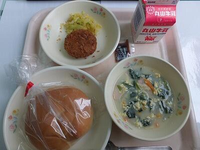 メンチカツバーガーは、主食と主菜が一緒になった料理です。野菜がたっぷり入ったスープと組み合わせました。皆さんも、ハンバーガーやサンドイッチを食べるときは、野菜たっぷりのサラダやスープを一緒に食べるようにしましょう。