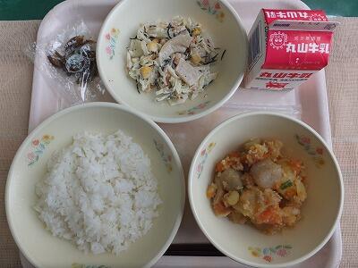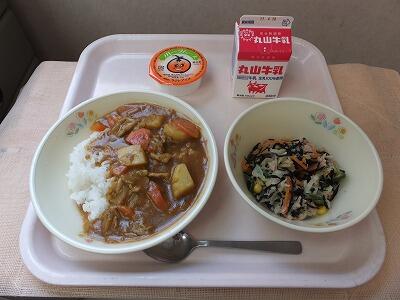 《今日の献立》カレーライス・ひじきのサラダ・フルーツムース・牛乳