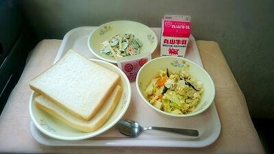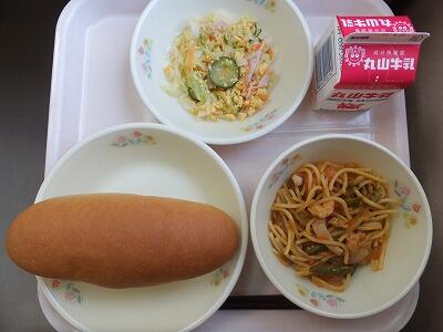 《今日の献立》減量パン・春野菜のスパゲティ・たまごサラダ・牛乳
