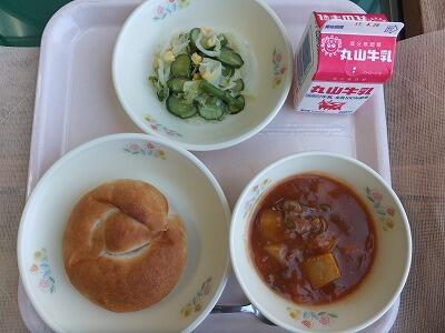 給食の献立を立てるときに気を付けているのは、主食であるご飯やパン・主菜である魚肉のおかず・副菜である野菜のおかずを組み合わせて栄養バランスの良いものにすることです。野菜の少ない食事は生活習慣病の原因にもなりかねません。学校給食では皆さんに必要な栄養基準量を満たすように毎日栄養価計算をしています。給食で出る野菜、魚、肉、ご飯の量を参考に栄養バランスのとれた食事を毎食食べるよう心がけてください。給食の献立の前に記号がついていますが、これは主食・主菜・副菜がわかりやすいように、主食を◯、主菜を●、副菜を☆で表しています。料理を組み合わせる時の参考にしてください。今日の主食は食パン、主菜はビーフシチュー、副菜はサラダです。