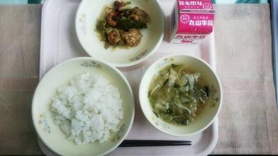 《今日の献立》麦ご飯・鶏肉とカシュナッツの味噌炒め・レタスのスープ・牛乳
