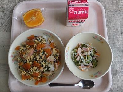 《今日の献立》親子丼・土佐酢和え・オレンジ・牛乳
