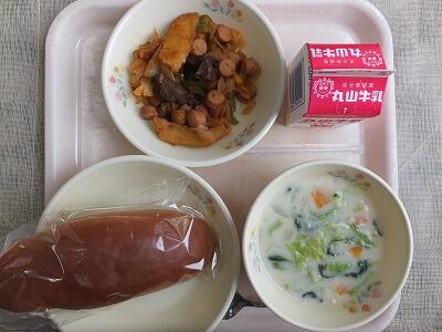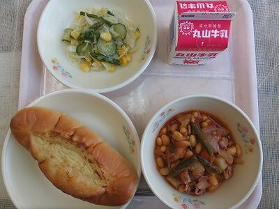 《今日の献立》マヨネーズパン・ポークビーンズ・スタミナサラダ・牛乳