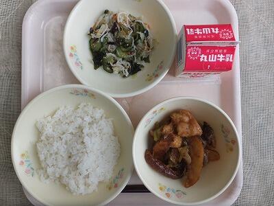 《今日の献立》麦ご飯・チキンとポテトの揚げ煮・海藻サラダ・牛乳