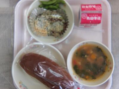 《今日の献立》麦ご飯・野菜のピリ辛煮・ごまじゃこ和え・牛乳・鮭ふりかけ