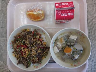 《今日の献立》おいしさギューッと丼・根菜ごま汁・くだもの・牛乳