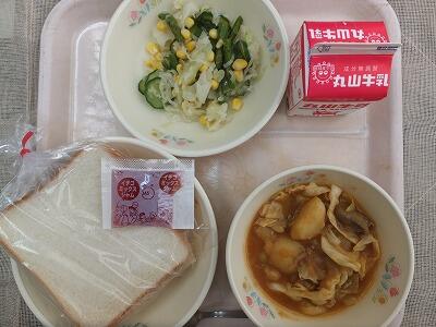 《今日の献立》食パン・イチゴジャム・肉と野菜のカレー煮込み・スタミナサラダ・牛乳