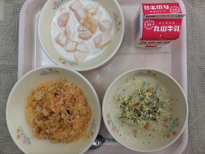 《今日の献立》ジャンバラヤ・コーンスープ・フルーツヨーグルト・牛乳