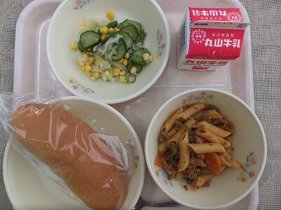 《今日の献立》減量コッペパン・ペンネポロネーゼ・ドレッシングサラダ・牛乳
