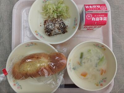 《今日の献立》マヨネーズパン・魚の変わり揚げ・ボイルキャベツ・野菜のクリームスープ・牛乳