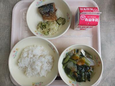 日本が世界の中でも長寿の国であるのは、バランスのとれた食生活のおかげだといわれています。私たちの食事は、主食のご飯を中心に、旬の食材を使った主菜(魚肉のおかず)、副菜(野菜のおかず)、汁物をバランスよく組み合わせた「日本型食生活」だからです。しかし、今、その食生活は洋風化し、油の多い食事へと代わってきています。今日の給食は「日本型食生活」の基本的なものです。主食が麦ご飯、主菜が鯖ごまみそ煮、副菜が三色和え、汁物がけんちん汁となっています。家でも主食・主菜・副菜を組合わせて食べましょう。