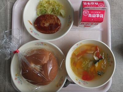 《今日の献立》ハンバーガー・野菜のカラフルスープ・牛乳