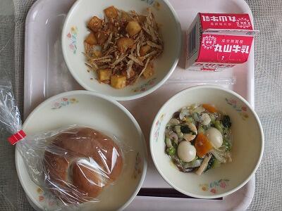 《今日の献立》マヨネーズパン・卵とじ・ひじきのサラダ・牛乳