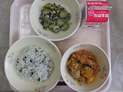 調理実習で卵やほうれん草をゆでるだけでも日頃手伝いをしているかどうかが分かります。日頃手伝いをしている人は、切り方も上手で、いらなくなった道具を洗ったり、食べる準備をしたりと、先を見越した作業ができます。いつまでもお家の人が皆さんの食事を準備することはできません。夏休みがもうすぐ来ます。お家の人に教えてもらってカレーくらいは作れるようになるといいですね。今日の夏野菜のカレーには、かぼちゃ、なす、トマトなどが入っています。嫌いな野菜でもカレー味にすると食べやすくなるので、色々な野菜を入れてみましょう。今日で1学期の給食は終わりです。夏休みになると牛乳を飲まなくなる人がいますが、牛乳には成長期に欠かせないカルシウムの他に、ビタミンB2も多く含んでいます。ビタミンB2は、皮膚や粘膜の健康に関わるビタミンで、口内炎の予防にも役立ちます。この他のビタミンも健康を維持するのに大切です。食欲がないからと言って、ソーメンばかり食べていては、ビタミンが不足し夏バテということになってしまいます。夏休みもビタミンを多く含む、牛乳、卵、海藻、野菜、豆などを意識してとるようにしましょう。