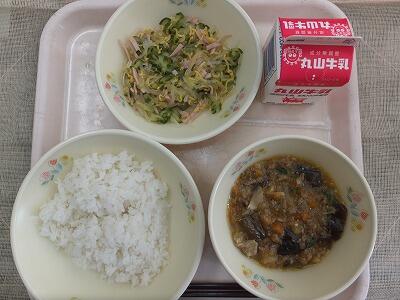 《今日の献立》麦ご飯・麻婆茄子・パンサンスー・牛乳