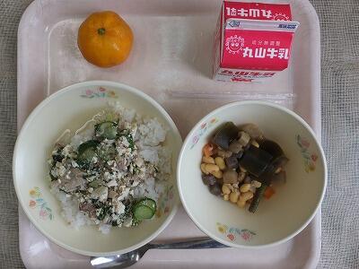 《今日の献立》冷や汁・五目豆・冷凍みかん・牛乳
