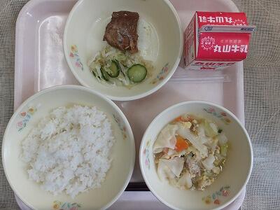 《今日の献立》麦ご飯・さば生姜煮・三色和え・和風ワンタン・牛乳