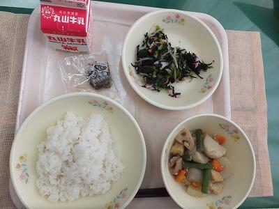 《今日の献立》わかめご飯・かぼちゃのそぼろ煮・ごまじゃこ和え・牛乳