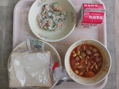 チリコンカンとは、メキシコやアメリカ南部のチリパウダーをきかせた豆の煮込み料理のことです。昔に比べ、豆を食べることが少なくなっています。今日のチリコンカンに入っている豆は大豆です。大豆には、たんぱく質、カルシウム、鉄、ビタミンB₁等、成長期の皆さんに必要な栄養素がたくさん含まれています。肉、魚、豆は同じくらいの割合で食べるようにしましょう。