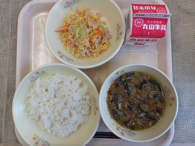 《今日の献立》麦ご飯・里芋のカレー煮・すまし汁・牛乳