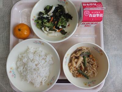 《今日の献立》麦ご飯・切干大根の炒め煮・へべす味噌和え・冷凍みかん・牛乳