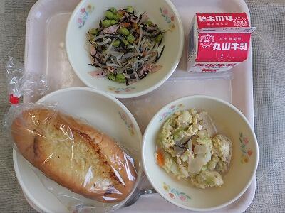 《今日の献立》マヨネーズパン・炒り豆腐・枝豆サラダ・牛乳