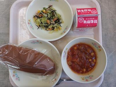 【今日の献立】黒糖パン・チリコンカン・ひじきのサラダ・牛乳