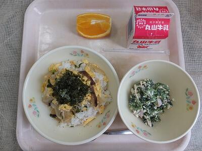 鶏飯は鹿児島県奄美地方の郷土料理で、ご飯の上に、蒸した鶏肉、卵、漬物などの具材と、のり、ねぎなどの薬味をのせ、薄く味付けした鶏がらスープをかけて食べます。ご飯に具をのせて食べるカレーや丼などの料理は、たくさんの材料が入っているようですが、それだけでは、野菜が足りません。必ず野菜たっぷりの和え物やスープと組み合わせて食べるようにしましょう。今日の鶏飯は、鶏肉、卵など体をつくる食べ物はたくさん入っていますが、野菜は少なくビタミンCが足りません。洋風白和えに入っているほうれん草や果物でビタミンCを補っています。