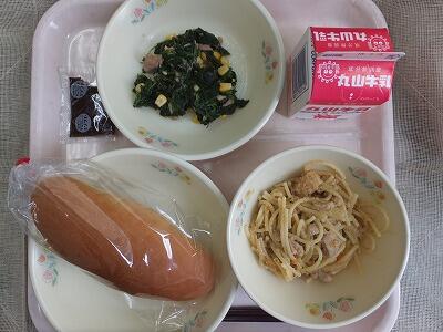 【今日の献立】減量コッペパン・チョコマーガリン・たらこスパゲティ・ほうれん草とコーンの和え物・牛乳