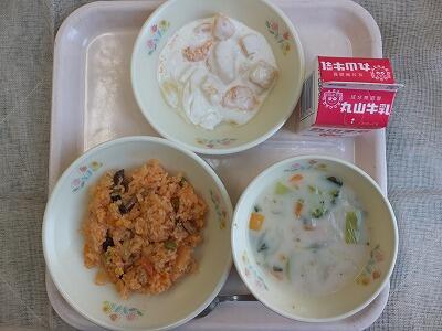 【今日の献立】チキンライス・野菜のクリームスープ・フルーツヨーグルト・牛乳