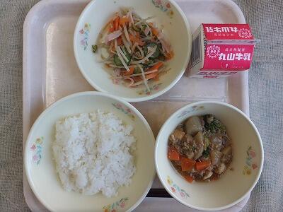 唐揚げは、小学校6年生で1番人気があった献立です。給食は肉の量が少ないと思うかも知れませんが、学校給食の基準で、肉の量は、小学校15g、中学校19gで、大豆製品や魚より少なくなっています。今日の肉の量は、小学校50g、中学校60gと基準の3倍です。今、家庭で肉を食べる機会が多くなっていますが、健康のためには、肉を塊で食べるのは3日に1回位にして、大豆や魚を取り入れるようにしましょう。給食には豆が多いといわれますが、学校給食摂取基準に基づいて献立を立てているからそうなるのです。生活習慣病を予防し、生涯健康に過ごすためには、豆や魚、野菜中心の食事をしていくことが大切です。